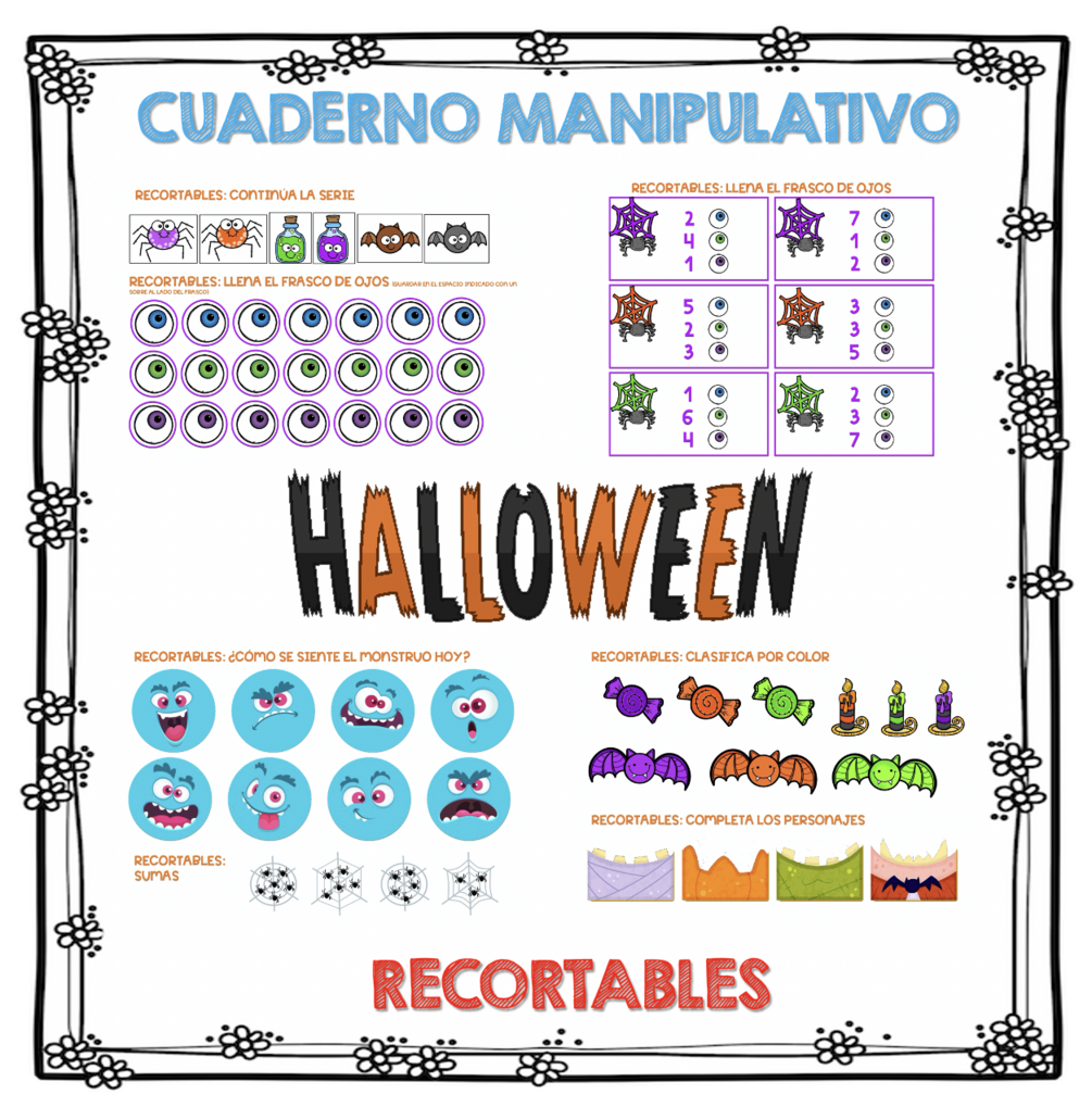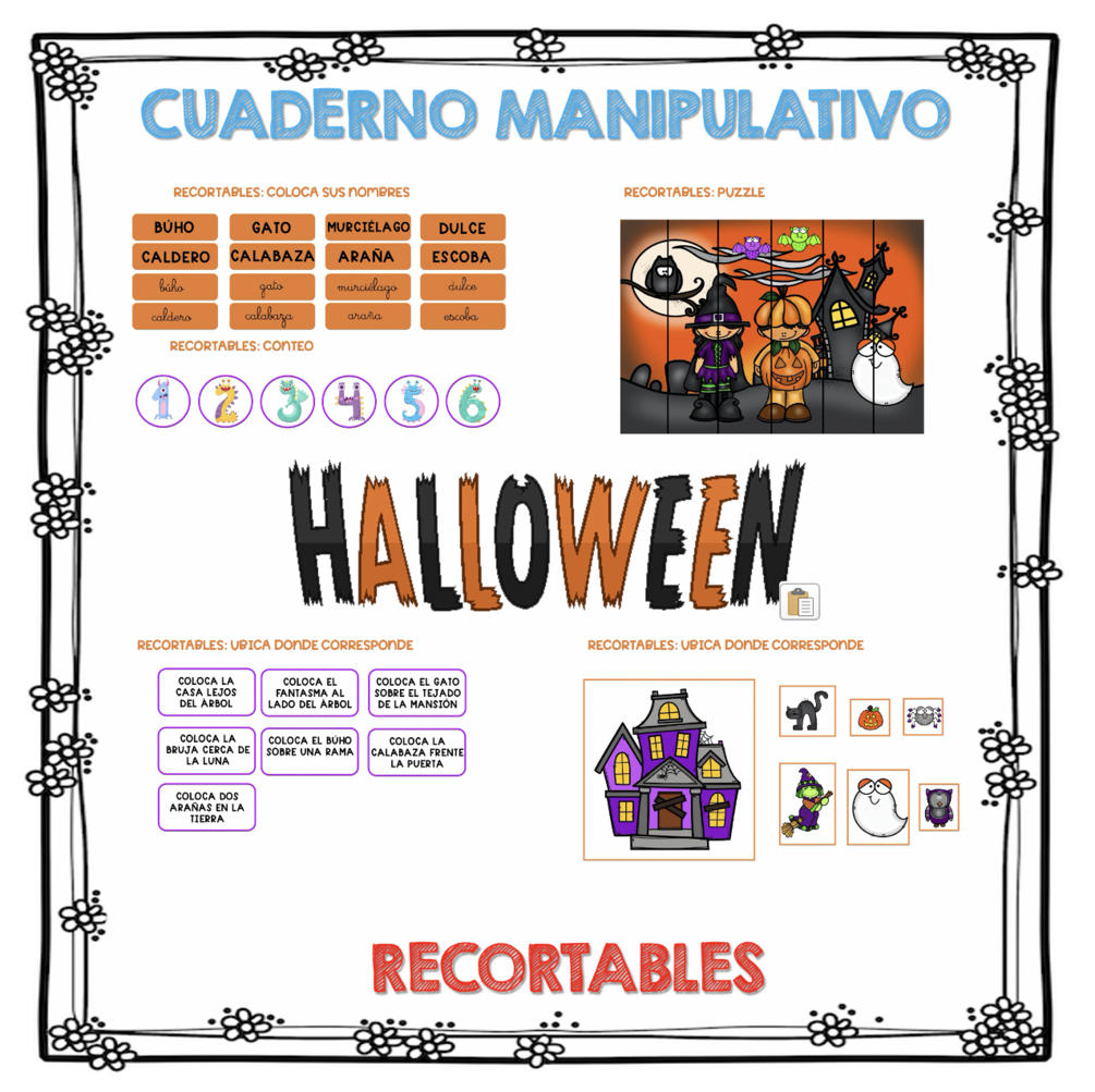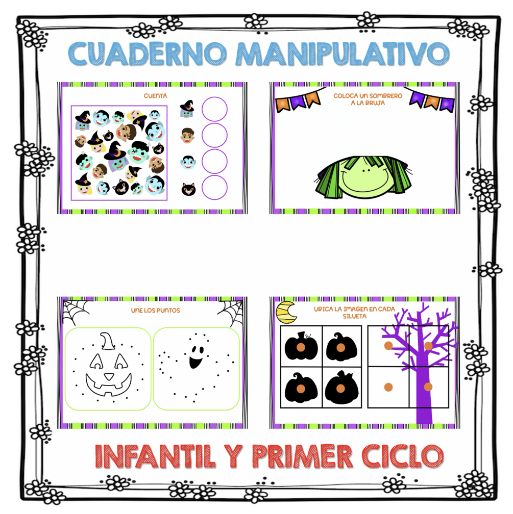 MANIPULATIVO PLASTIFICABLE INFANTIL Y PRIMER CICLO + CUADERNO 250 PAG HALLOWEEN